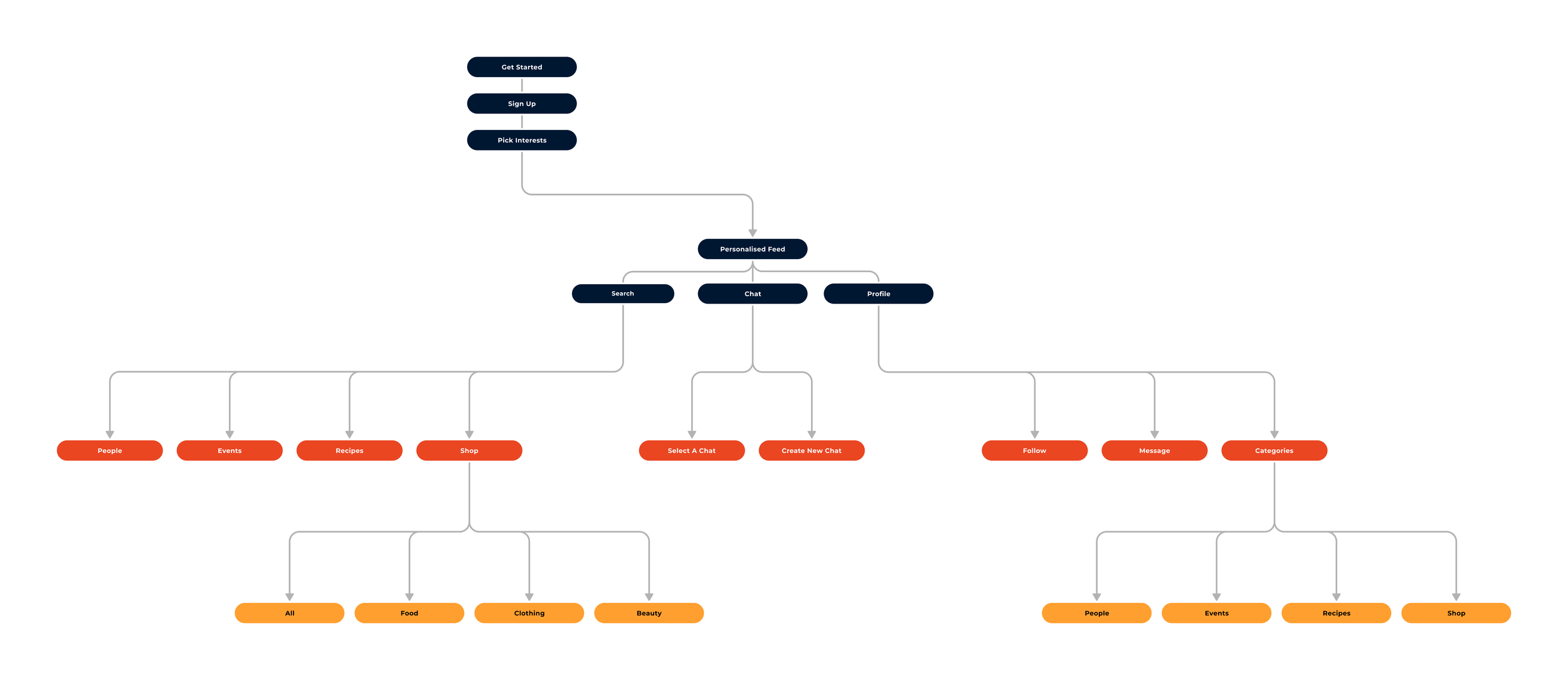 From there, the navigation architecture separates the four core pillars - Feed, Search, Chat, and Profile - keeping the information hierarchy flat and learnable.