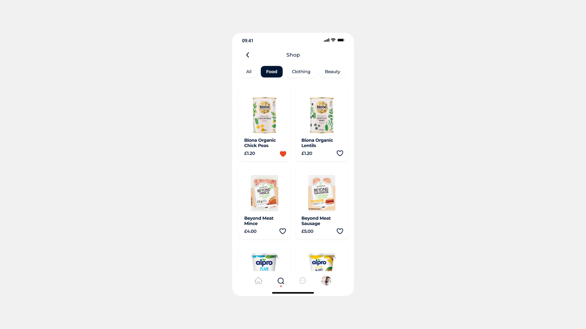 The shop spans food, clothing, and beauty - the three core categories of vegan lifestyle purchasing. Filtering is lightweight and familiar, lowering the barrier to discovery while keeping the experience native to the social app rather than redirecting out to third-party retailers.
