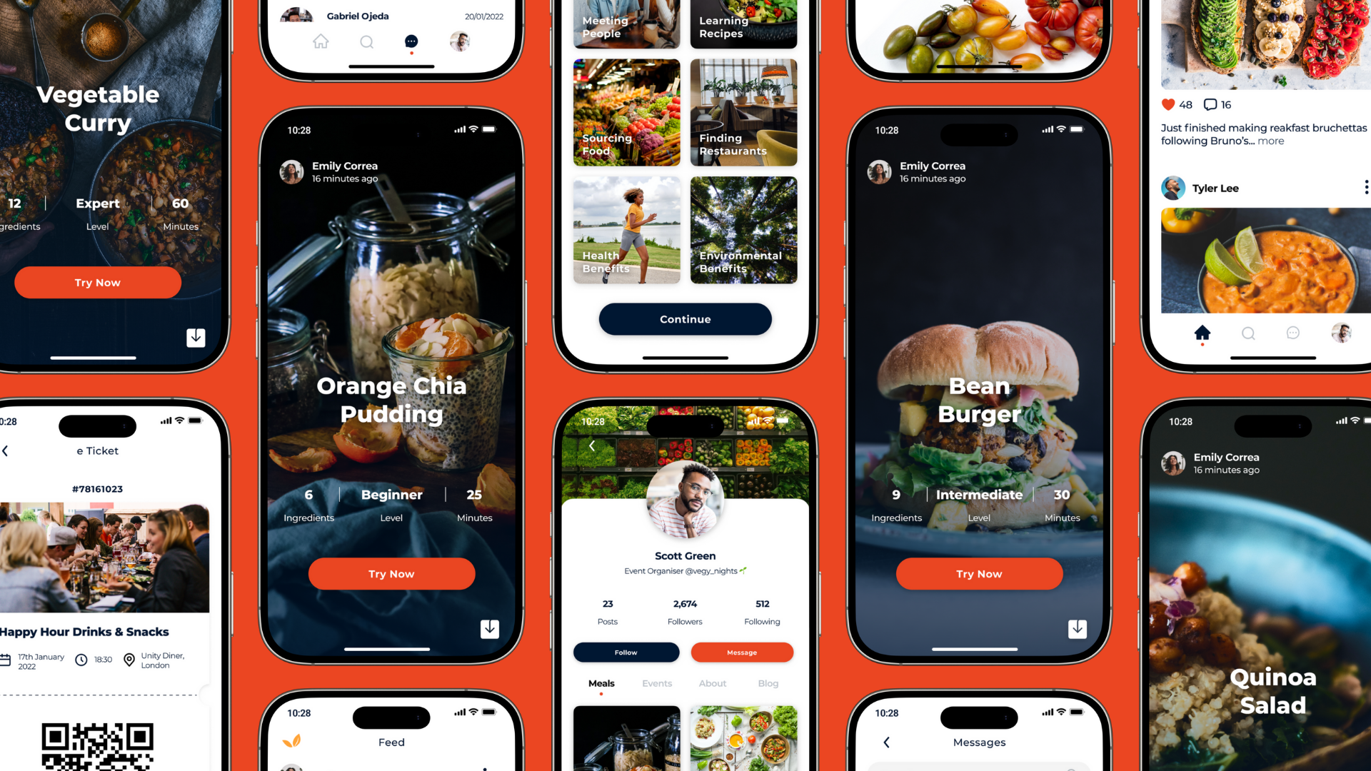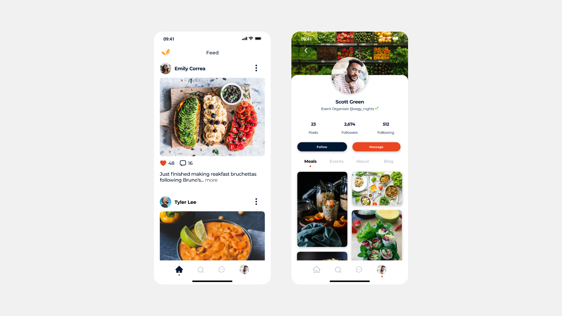 The feed surfaces recipes, community posts, and live tutorials. User profiles double as creator portfolios - showing meals, events, and a follower community, designed to reward content creators and establish trust.